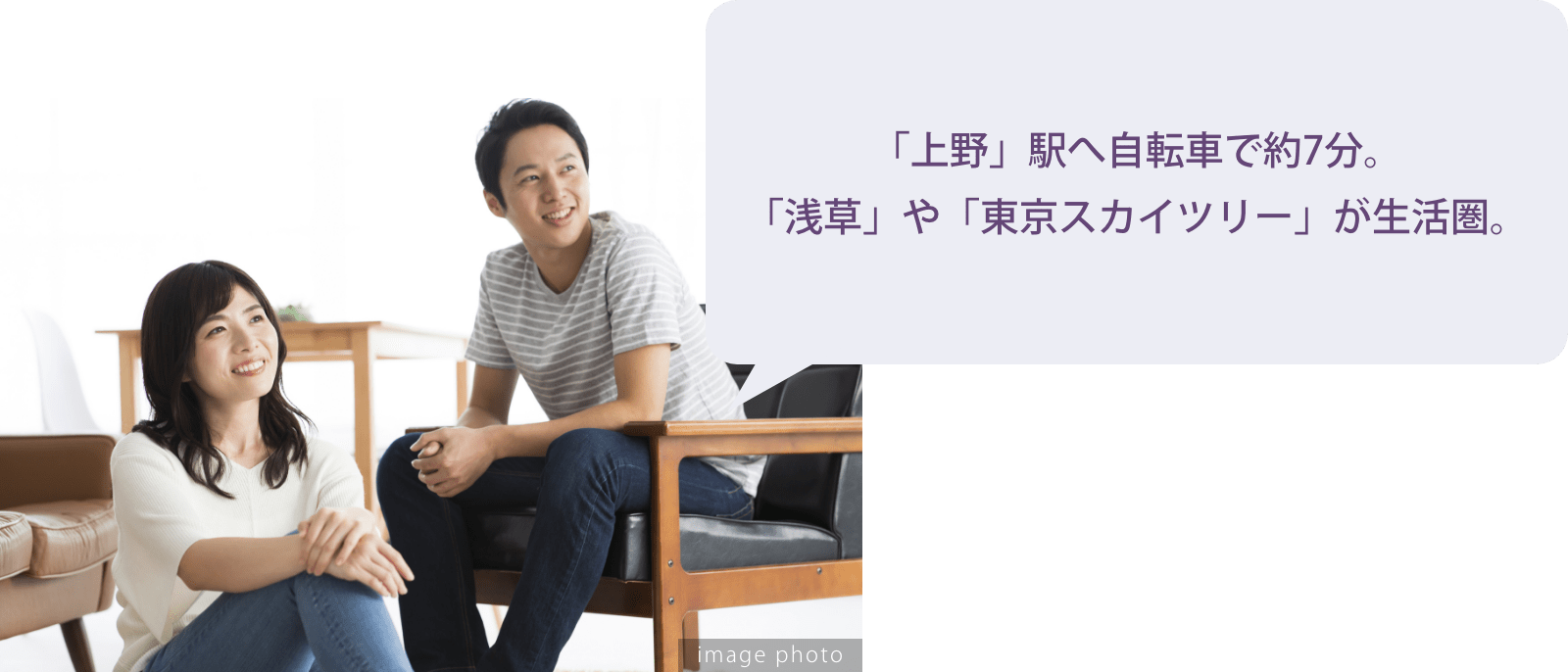 台東区が立地と価格のバランスが良いなと、目をつけたのが上野や浅草へ自転車でも行ける入谷エリア。中でもこちらの物件は上層階・角住戸・50㎡超の2LDKが7000万円台※1(※1000万単位)で、同じようなアクセスの物件と比べても好条件。将来的に運用・売却の想定もしている身からすれば、このアクセス、駅距離でこの価格であれば、月々の支払いも無理なくできそうですし、資産として大きな損をすることもないだろうと判断し、購入を決断しました。