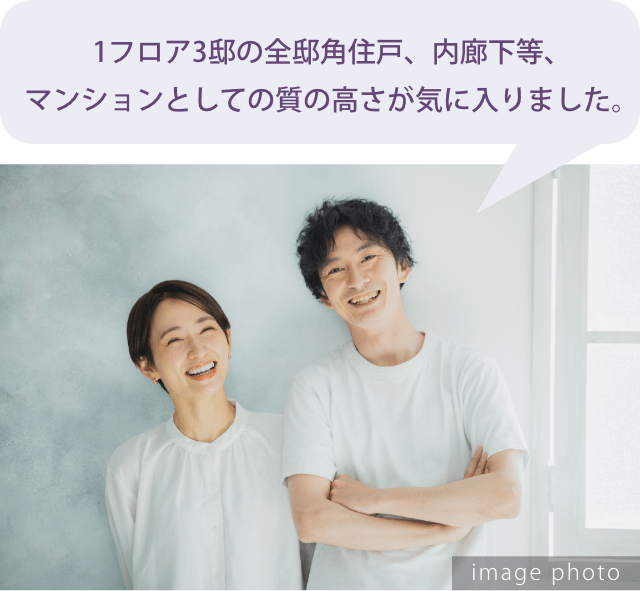 デザインは隠れ家のような雰囲気で、とてもシックな印象。せっかく購入するなら上品なマンションが良いと考えていたので、十分だと思います。加えて、全邸角住戸。都心に非常に近接した立地でありながら、しっかりと開放感、プライベート感が得られる点は良い条件だと思います。 -