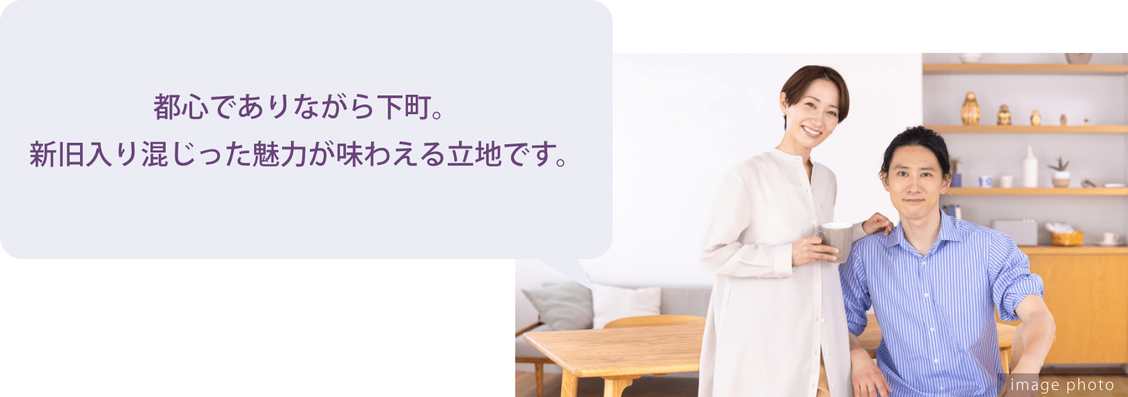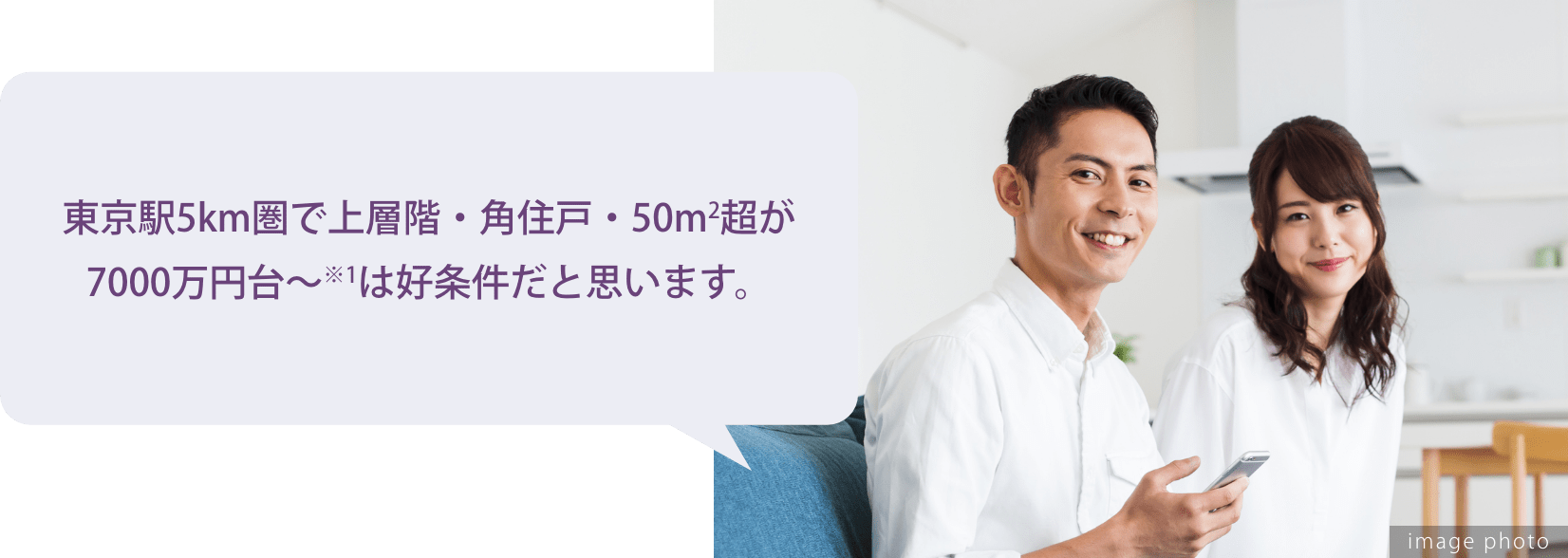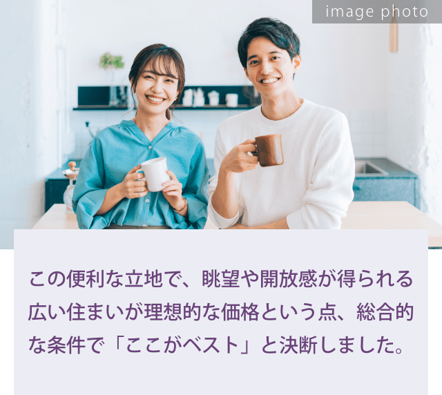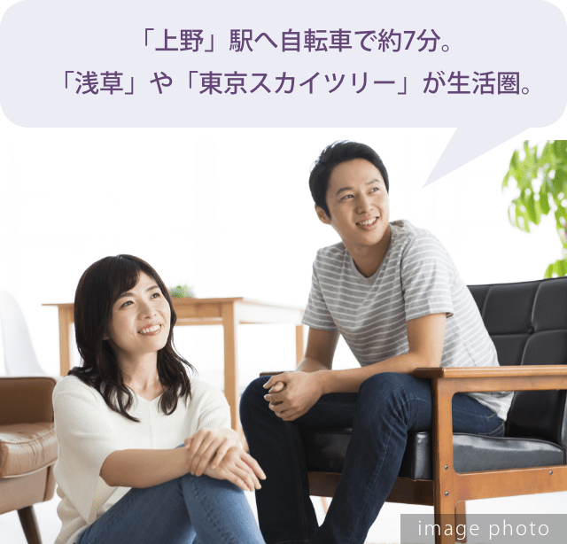 台東区が立地と価格のバランスが良いなと、目をつけたのが上野や浅草へ自転車でも行ける入谷エリア。中でもこちらの物件は上層階・角住戸・50㎡超の2LDKが7000万円台※1(※1000万単位)で、同じようなアクセスの物件と比べても好条件。将来的に運用・売却の想定もしている身からすれば、このアクセス、駅距離でこの価格であれば、月々の支払いも無理なくできそうですし、資産として大きな損をすることもないだろうと判断し、購入を決断しました。
