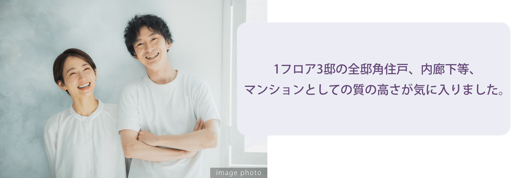 デザインは隠れ家のような雰囲気で、とてもシックな印象。せっかく購入するなら上品なマンションが良いと考えていたので、十分だと思います。加えて、全邸角住戸。都心に非常に近接した立地でありながら、しっかりと開放感、プライベート感が得られる点は良い条件だと思います。 -